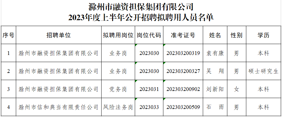 市擔保集團2023年度上半年公開招聘擬聘用人員公示