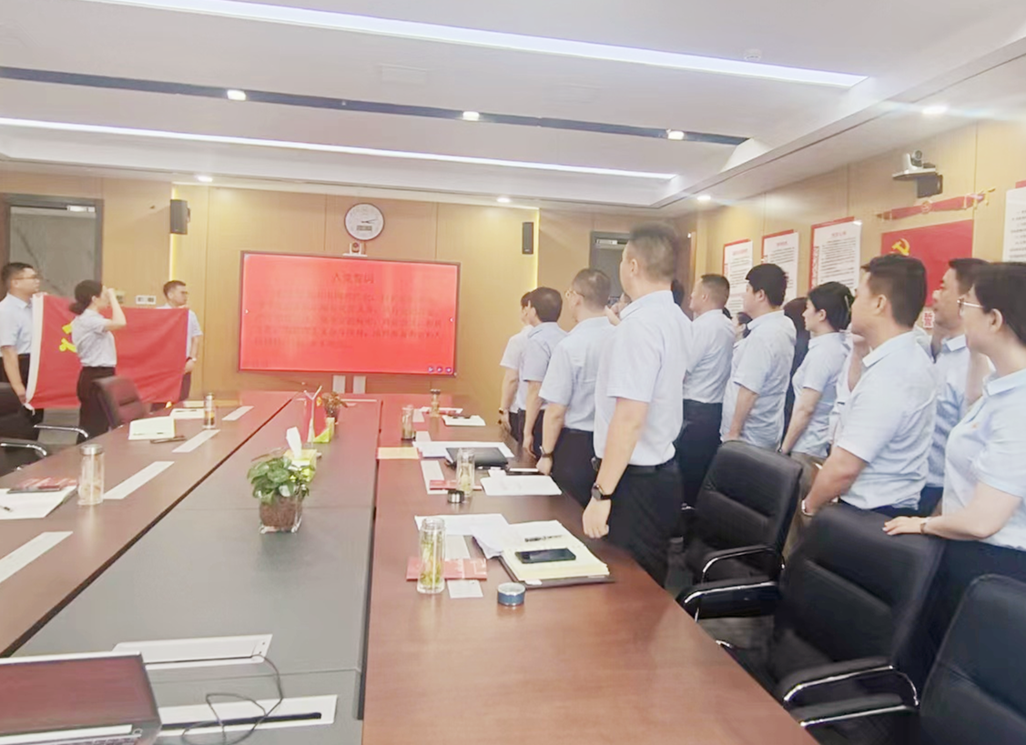 在優(yōu)秀黨員代表領(lǐng)誓下,全體黨員面對鮮紅的黨旗和莊嚴的誓詞,共同高舉右拳,莊嚴宣誓。鏗鏘有力的宣誓聲響徹會場,錚錚誓言提醒著黨員們永葆入黨初心,踐行使命擔(dān)當(dāng)。