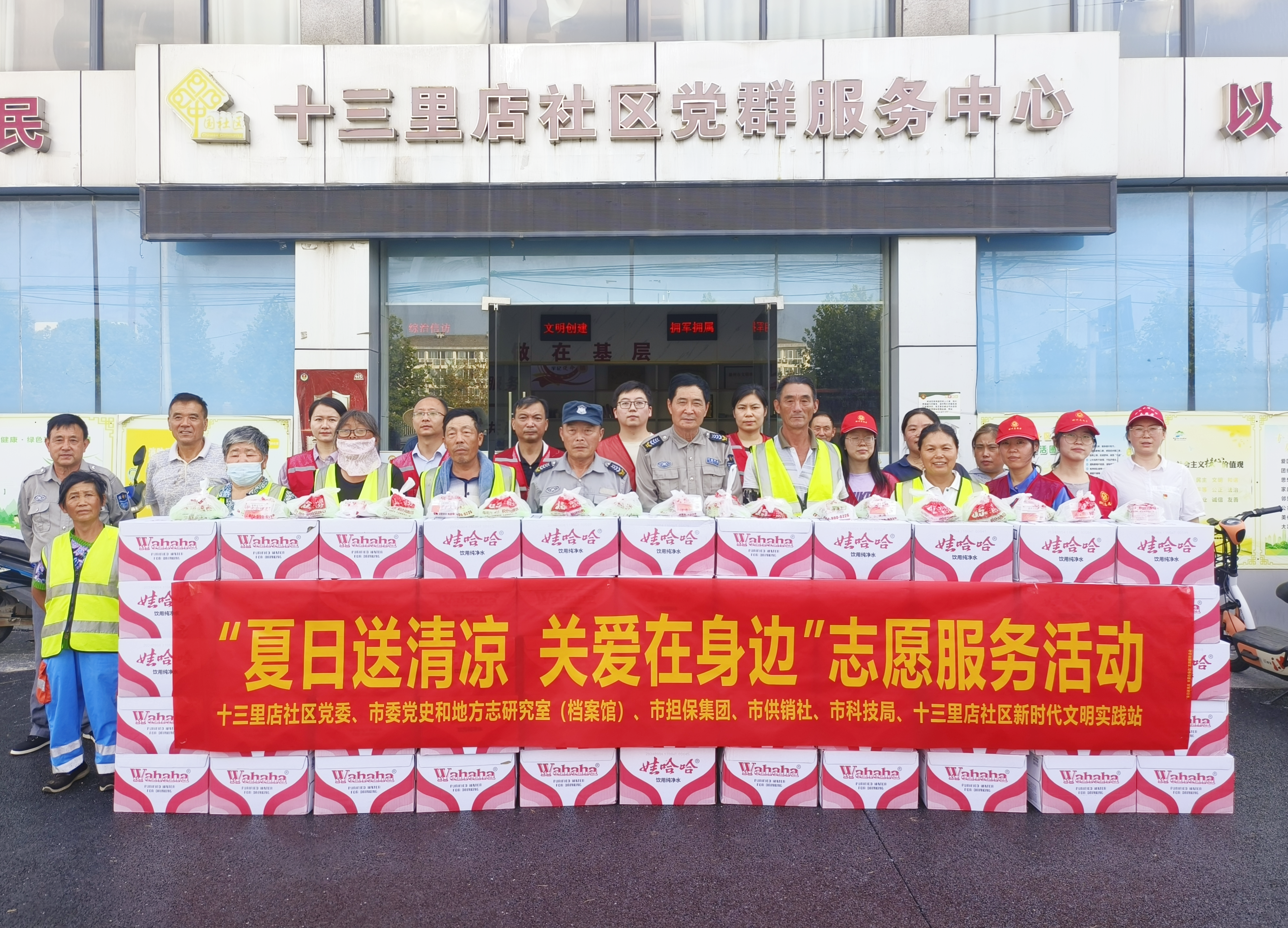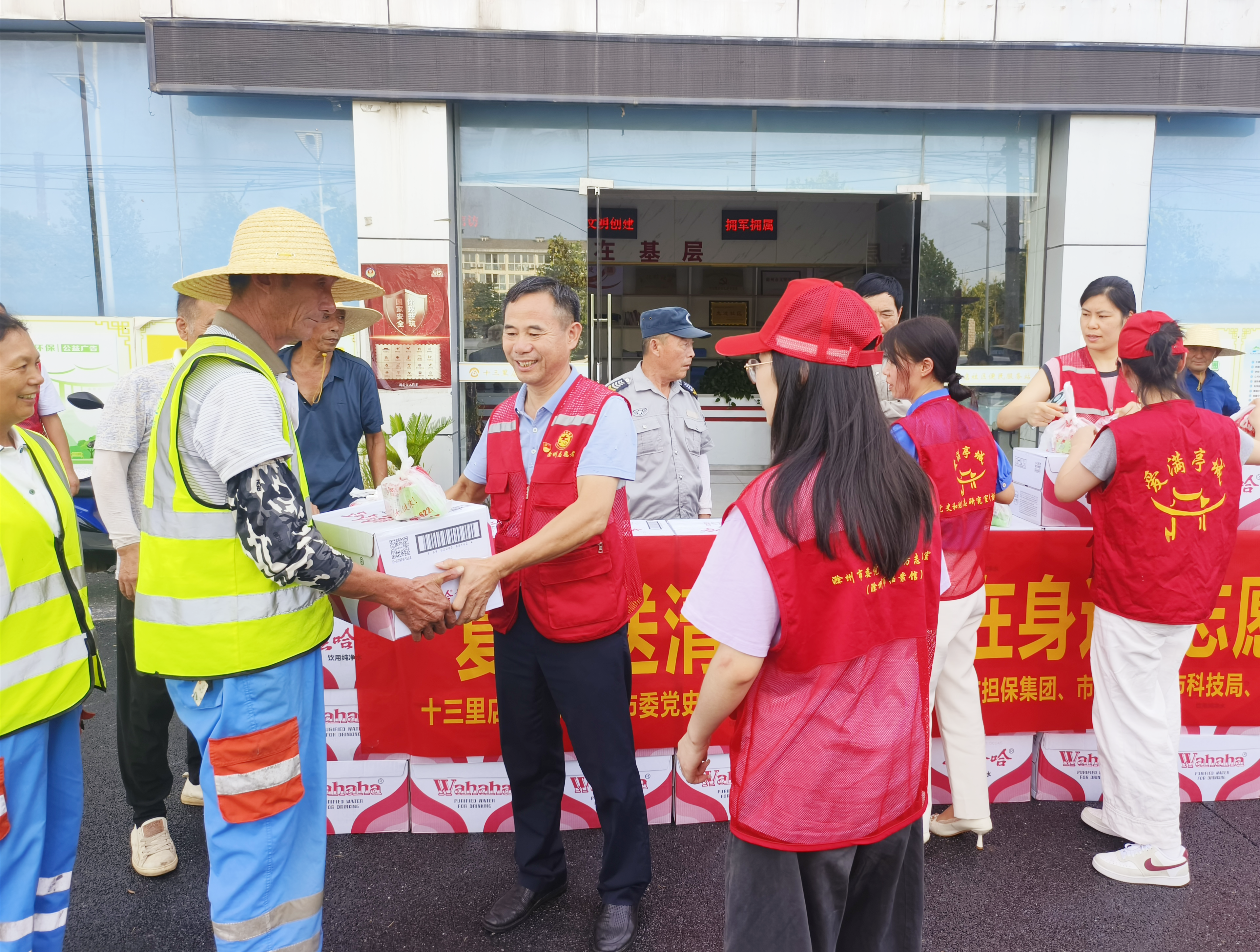 2024年8月12日,集團黨支部和普惠擔(dān)保公司黨支部的黨員志愿者們來到十三里店社區(qū)黨群服務(wù)中心,與包保社區(qū)的其他黨員志愿者一起,將精心準(zhǔn)備的礦泉水、香皂、風(fēng)油精、花露水等防暑降溫物品一一分送到社區(qū)每一名環(huán)衛(wèi)工人手中,并叮囑環(huán)衛(wèi)工人們高溫作業(yè)要注意防暑降溫,加強自我防護,確保自身安全。