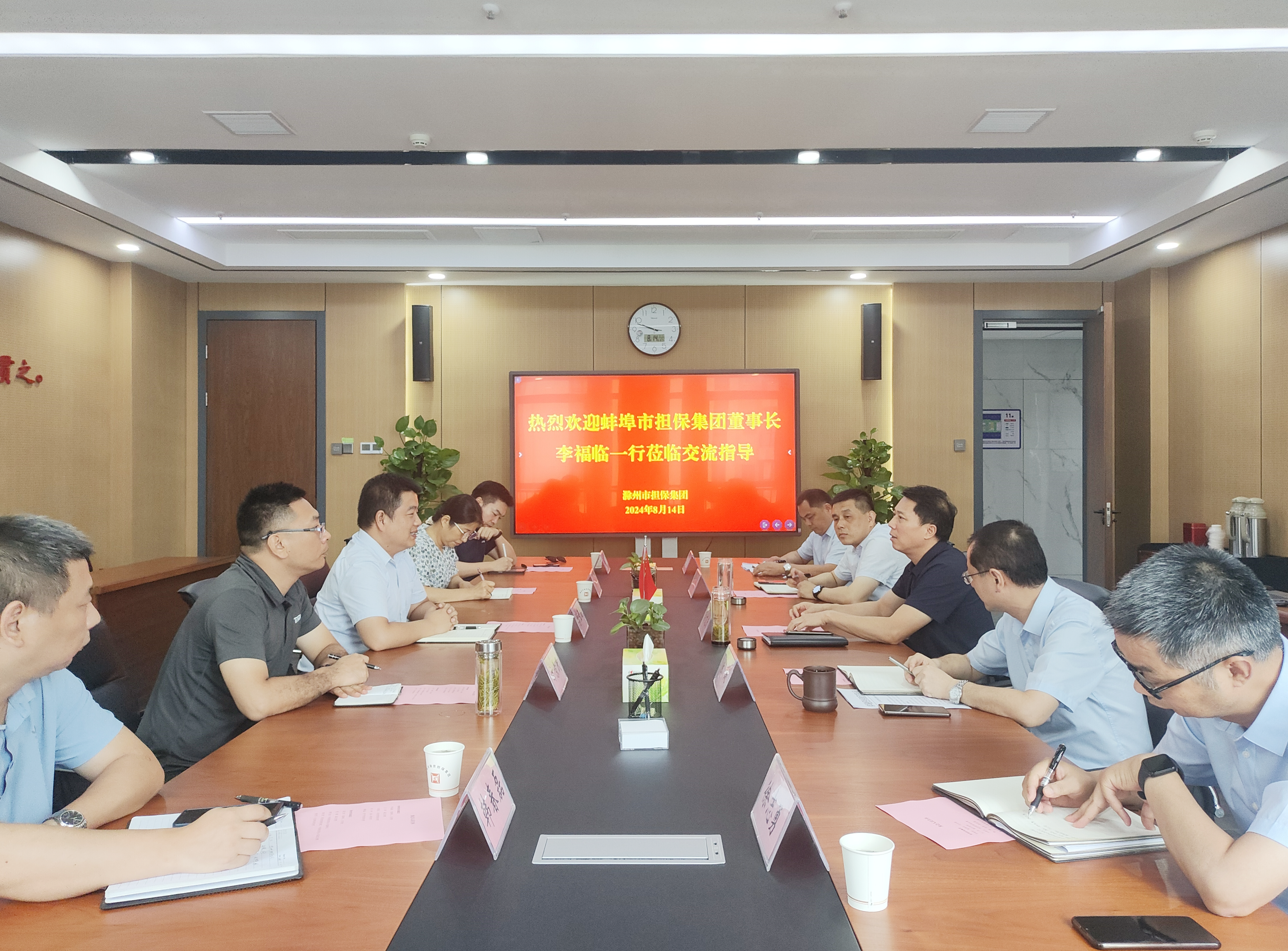 8月14日上午,蚌埠市擔(dān)保集團(tuán)董事長、總經(jīng)理李福臨一行到訪集團(tuán)交流座談,集團(tuán)董事長、總經(jīng)理高文進(jìn),部分班子成員及相關(guān)部室負(fù)責(zé)人參加座談。