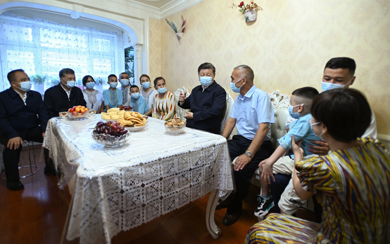 7月12日至15日,中共中央總書(shū)記、國(guó)家主席、中央軍委主席習(xí)近平在新疆考察。這是13日上午,習(xí)近平在烏魯木齊市天山區(qū)固原巷社區(qū),同維吾爾族居民阿布來(lái)提·吐?tīng)栠d一家人圍坐在一起拉家常。新華社記者 謝環(huán)馳 攝