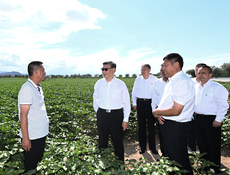 7月12日至15日,中共中央總書(shū)記、國(guó)家主席、中央軍委主席習(xí)近平在新疆考察。這是13日下午,習(xí)近平在新疆生產(chǎn)建設(shè)兵團(tuán)八師一四三團(tuán)農(nóng)一連棉花種植基地考察。新華社記者 謝環(huán)馳 攝