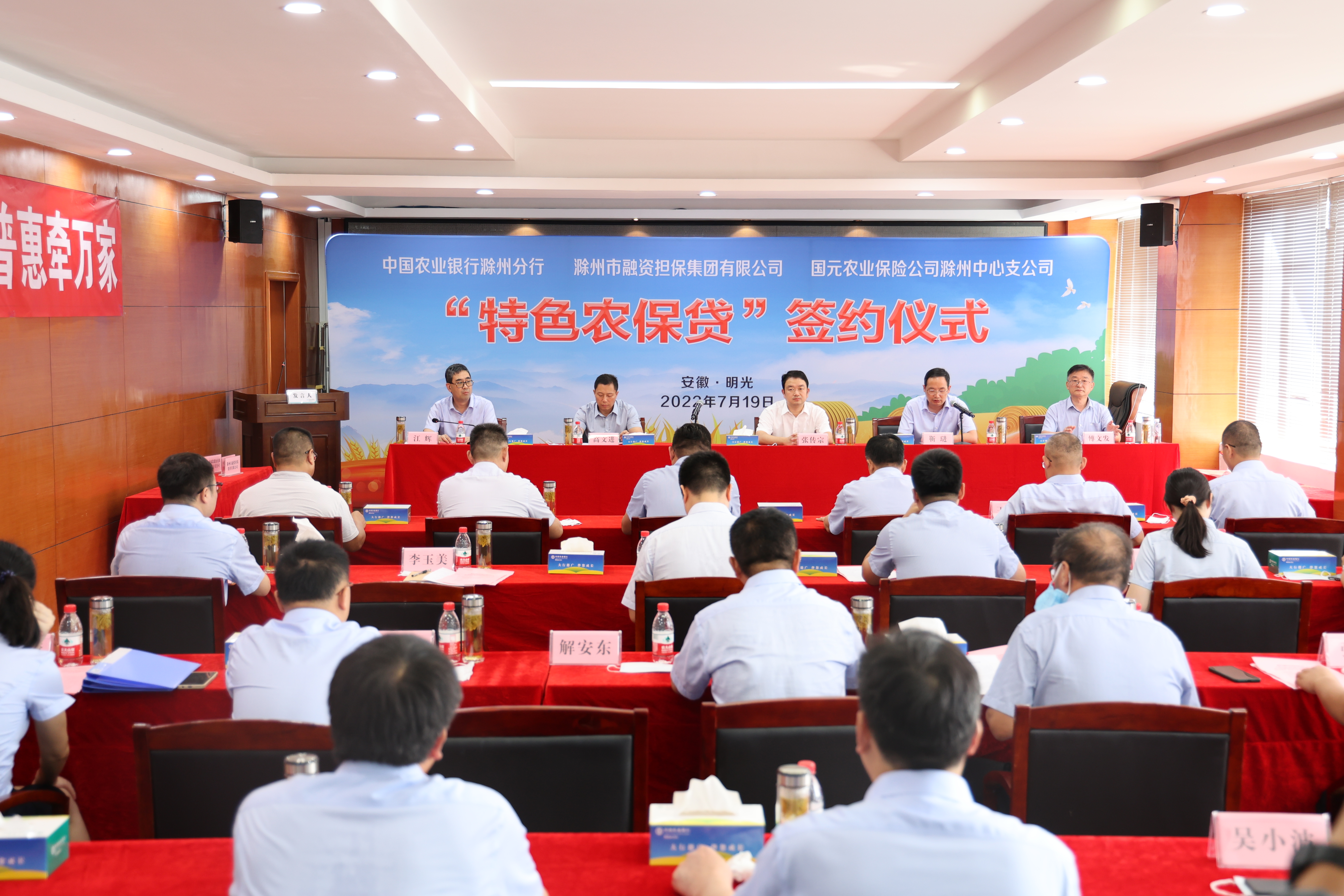 為進(jìn)一步更好地服務(wù)“三農(nóng)”,助力滁州鄉(xiāng)村振興,7月19日,市擔(dān)保集團(tuán)、農(nóng)行滁州分行及國(guó)元農(nóng)保滁州中支在明光市共同舉辦“特色農(nóng)保貸”簽約儀式。明光市委副書(shū)記、市長(zhǎng)張傳宗,滁州市擔(dān)保集團(tuán)黨委書(shū)記、董事長(zhǎng)、總經(jīng)理高文進(jìn),農(nóng)行滁州分行黨委書(shū)記、行長(zhǎng)靳琎,國(guó)元農(nóng)保滁州中支黨支部書(shū)記傅文發(fā)等有關(guān)領(lǐng)導(dǎo)及部分農(nóng)戶代表出席簽約儀式。